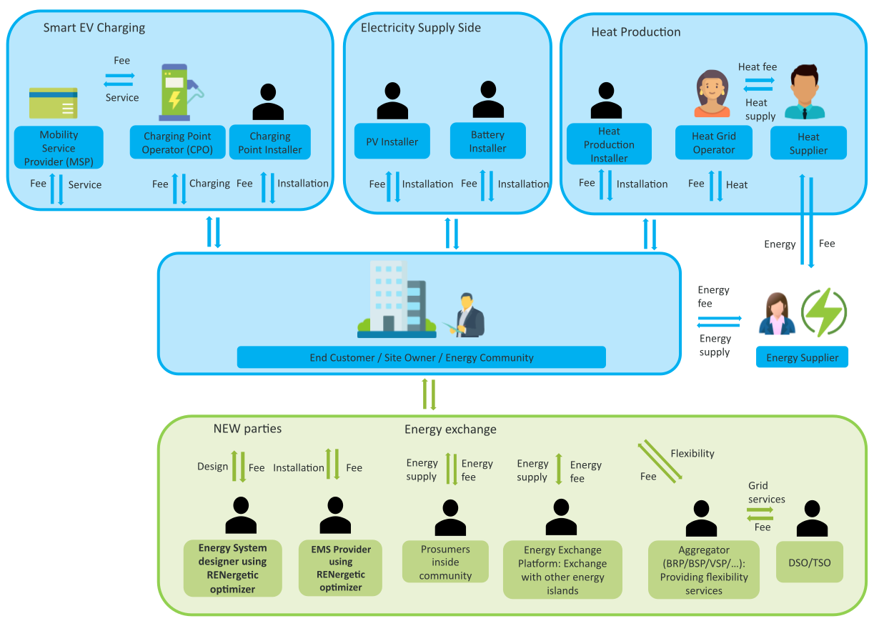 The five business models are situated in overlapping value networks as depicted in Figure 1. As client of the services, the central players in the network are the end consumer, the site owner or the energy community. Some parts of the network are specific for one business model, like the parts concerning smart EV charging, electricity supply side optimization and heat production. In the RENergetic business models, the traditional networks are extended with less conventional parties, shown in green.