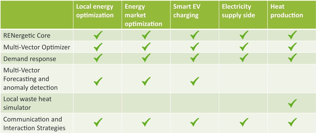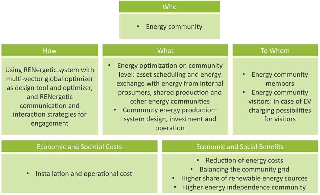 The RENergetic platform’s functionalities and its social toolbox are presented as building blocks that can be utilized together in function of the targeted business model. The five first building blocks in Table 1 are part of the RENergetic platform. The RENergetic communication and interaction strategies are a set of guidelines and insights, presented as a package. Since the RENergetic platform can be used both for operational optimization as for design and feasibility studies, all the discussed business models use some of its functionalities.